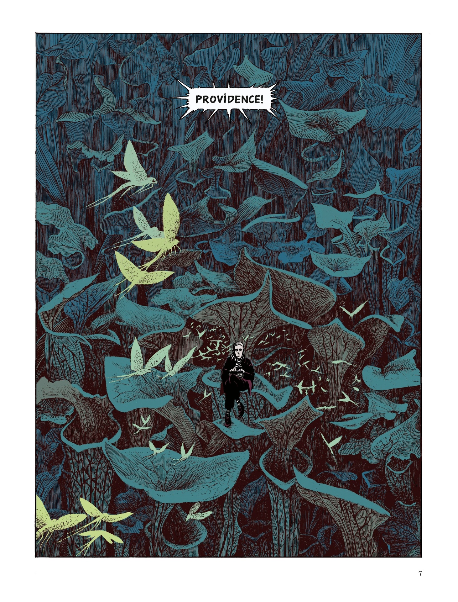 The comic book opens with a Lovecraft quote: “There are twists of time and space, of vision and reality, which only a dreamer can divine”, the opening sequence depicting Providence half-asleep on a mountain of giant trumpet pitchers that could swallow him whole in their cones. Where the comic book shines is in its graphic depiction of the dream world, of the supernatural, blended with ‘reality’, blurring that line in perfect lovecraftian fashion.
