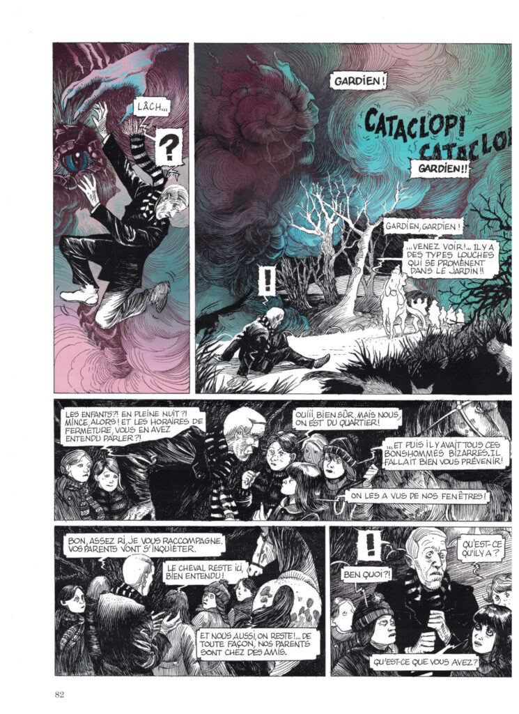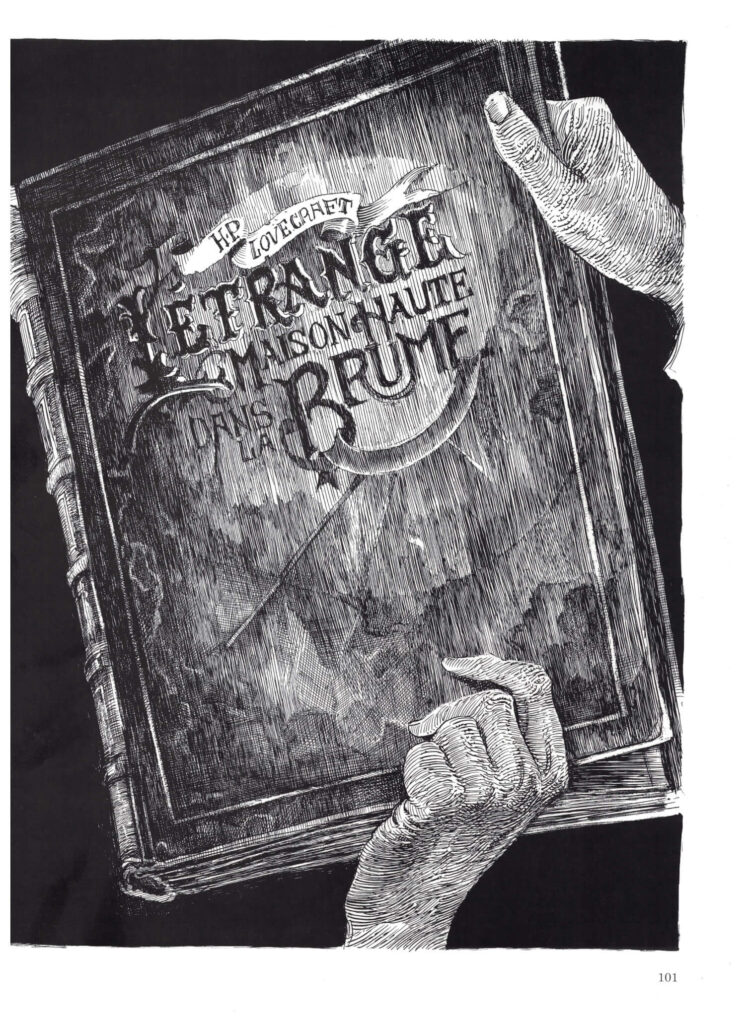 The book is found by the manager, who takes it on her to read it, and there is printed in full, Lovecraft’s short story ‘The Strange House in the Mist’, with gorgeous colored illustrations, shifting from the grey reality of the book to an incredible, dream-like double-paged opening that simply has to be shown here.