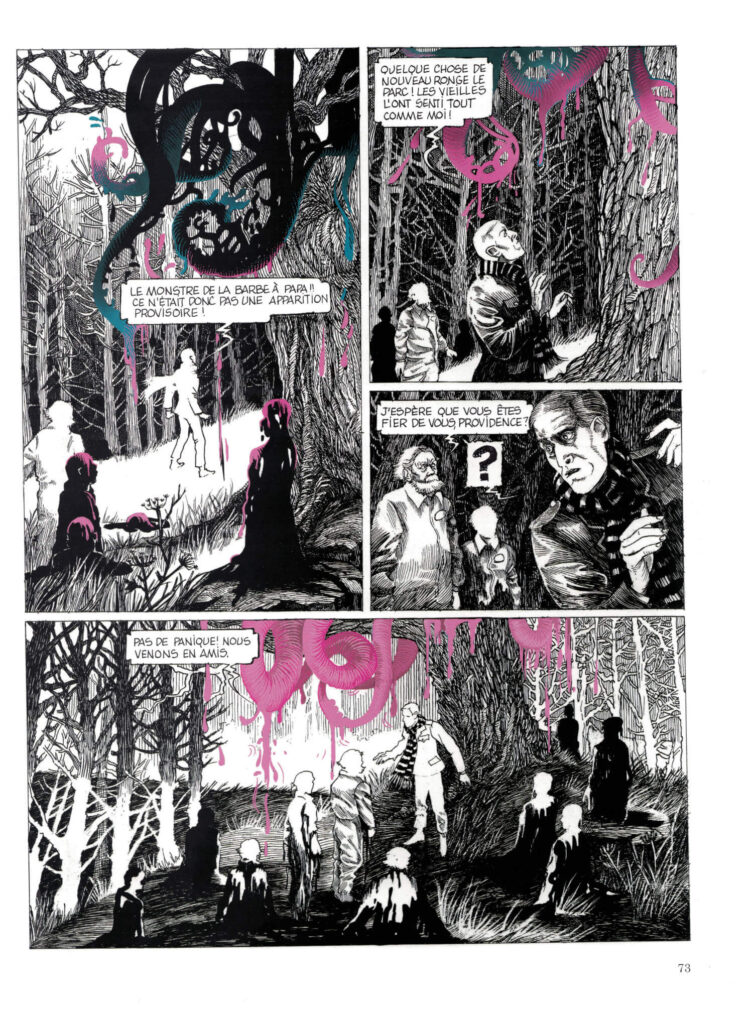 What makes this work so visually enticing is the contrast between ‘reality’ and the supernatural. Daria Schmitt portrays the former in shades of gray, where, at times and unbeknownst to most of its rational inhabitants, phantasmagorical entities, constructs, and effects all painted in the most eerie and unnatural of pastel colors, literally seep into the page, as in this full page panel where Providence investigates disquieting changes in the park’s trees after supernatural events start occurring in the park, and tentacles dripping colorful ooze spread through the vegetation.